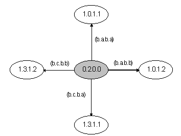Si on effectue le produit libre de ces quatre systèmes de transitions dans l'ordre, nous obtenons un système de transitions global comportant 48 états et 16 transitions. La figure suivante représente une petite section du système de transitions global, centrée sur l'état global e(0.2.0.0) qui représente l'état courant global, et qui est composé des états courants des sous systèmes de transitions. Les transitions marquées en gras dans les systèmes de transitions du Tableau I.2 représentent une unique transition globale, également marquée en gras, de la Figure I.3.