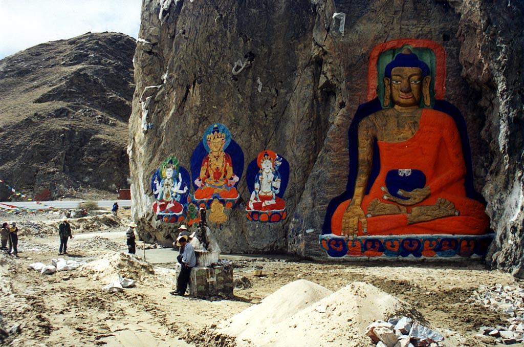| Bouddhas sculptés à même le roc sur la route entre l'aéroport et Lhassa. Des ouvriers étaient en train de les restaurer. |