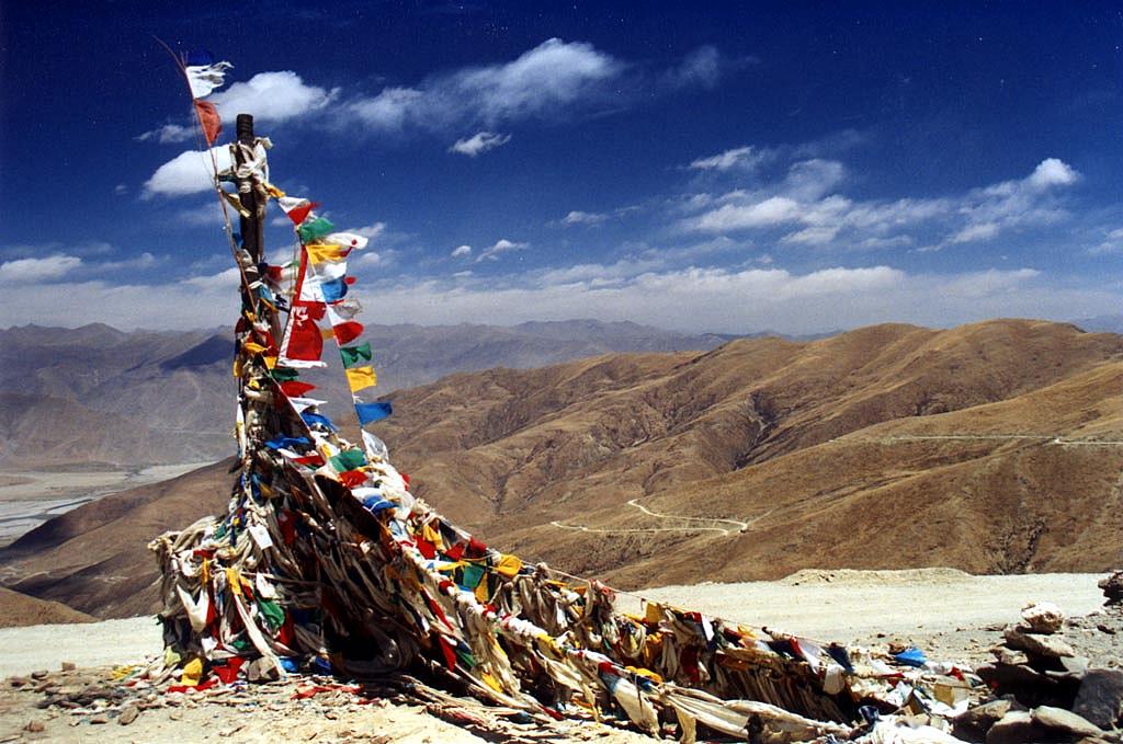 | Drapeaux à prières au sommet du col de Kamba La. Il y a un très fort (et glacial) vent. On aperçoit au loin la route que nous venons d'emprunter pour monter jusque là. |