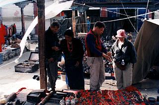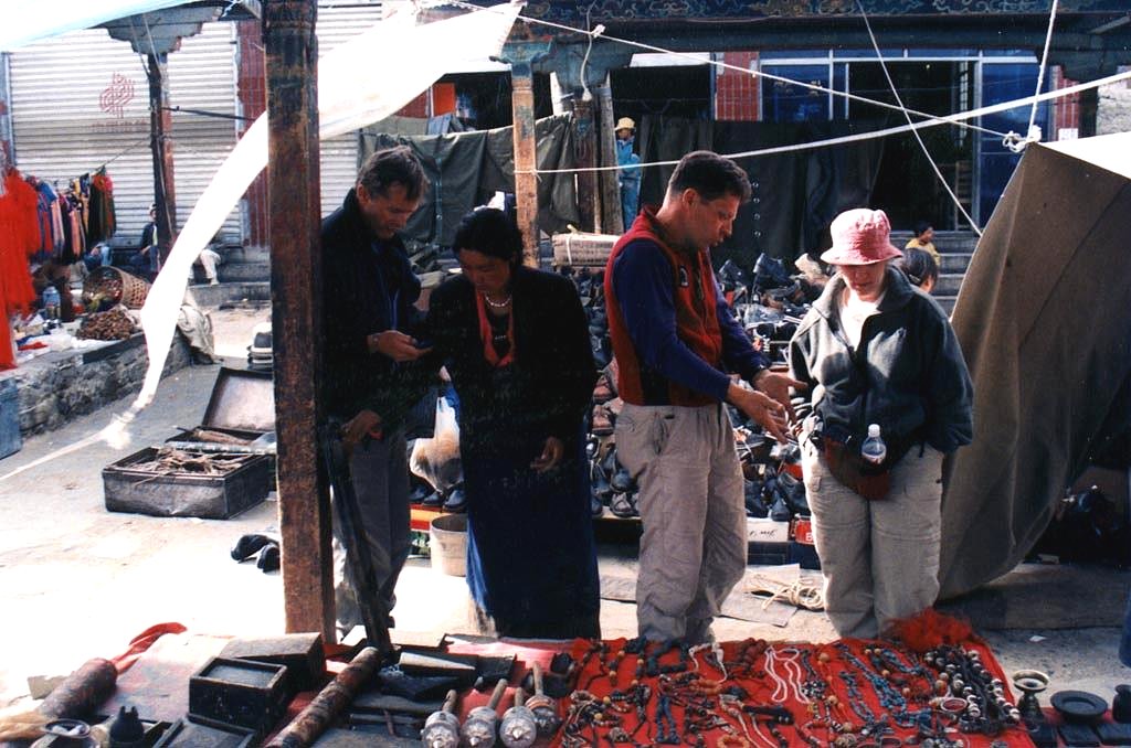 | Jean-Pierre, André et Elyse faisant du marchandage. Notez les moulins à prières ainsi que les colliers de pierres sur la table. Nous sommes ici dans la section des bijoux et objets de culte. |