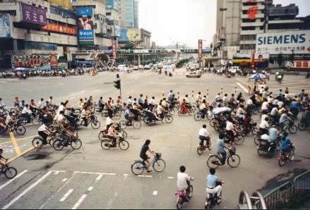| Rue typique de Lhassa. Pas de voitures personnelles (Celle de la photo est un taxi), que des vélos. On remarque que beaucoup de femmes portent un masque à cause de la pollution et des odeurs. |