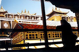 | Elyse devant une étrange pièce séparée des autres par une cour intérieure. Nous sommes ici au coeur même du Potala comme le témoigne les pagodes dorées. |