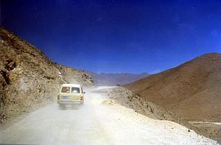 | Le col de Kamba La, peu après Lhassa. Une route à flanc de montagne, sinueuse et étroite dans nos jeeps remplies à craquer de matériels. |
