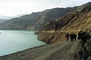La route longe le lac s'élevant parfois à plus d'une centaine de mètres de la surface. Les conducteurs ne ralentissent même pas lors des nombreux tournants d'où peut surgir à tout instant un camion de ravitaillement chinois roulant en sens inverse. Nous trouvons justement un de ceux-ci arrêté sur le bord de la route, la bloquant sur la moitié de sa largeur. Et voilà notre chinois qui, sans ralentir, essaye de passer quand même! On était quatre à crier "STOP!" cette fois! Nous faisons le passage à pied et regardons la Toyota s'engager centimètres par centimètres, une roue partiellement dans le vide...