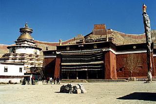 Le matin suivant, nous marchons à travers la section tibétaine jusqu'au monastère de Pelkor Chode, vieux de près de 600 ans. Il est encore très tôt le matin, le soleil plombant reste en partie caché par le Dzong, véritable forteresse perchée sur le sommet d'un pic rocheux en plein milieu de la ville. Les rues sont encore quasi-désertes et nous regardons les typiques maisons tibétaines bordant la grande allée de terre où nous marchons.