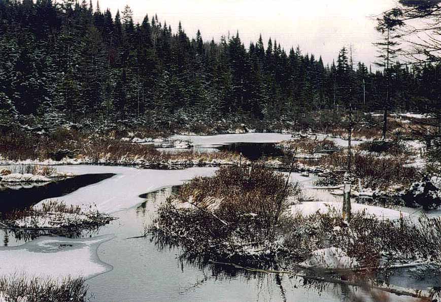 Juste à coté du refuge du ... se trouve un marécage, fruit d'un ruisseau qui s'y meurt. Les derniers effets de l'hiver lui donne un certain panache et nous offre un splendide tableau. A noter qu'il y a un barrage de castors qu'il faut emprunter afin de se rendre de l'autre coté mais il se négocie sans trop de difficulté. Nous sommes ici au milieu de la piste a égale distance entre les entrées ouest et est.