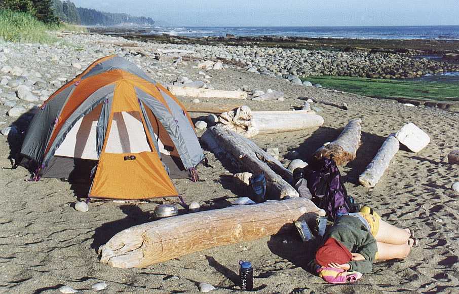 Tous les campings sont situés sur les plages, à proximité de cours d'eau se jettant dans la mer. Nous sommes ici au camping de Michigan Creek, du nom d'un navire à vapeur s'y étant échoué en 1893. On installe tout simplement sa tente n'importe où sur la plage. Il faut cependant être prudent et consulter les tables de marées ainsi que les prévisions météo de la nuit! La photo montre la vue du littoral vers le sud, que nous avons emprunté le lendemain matin.