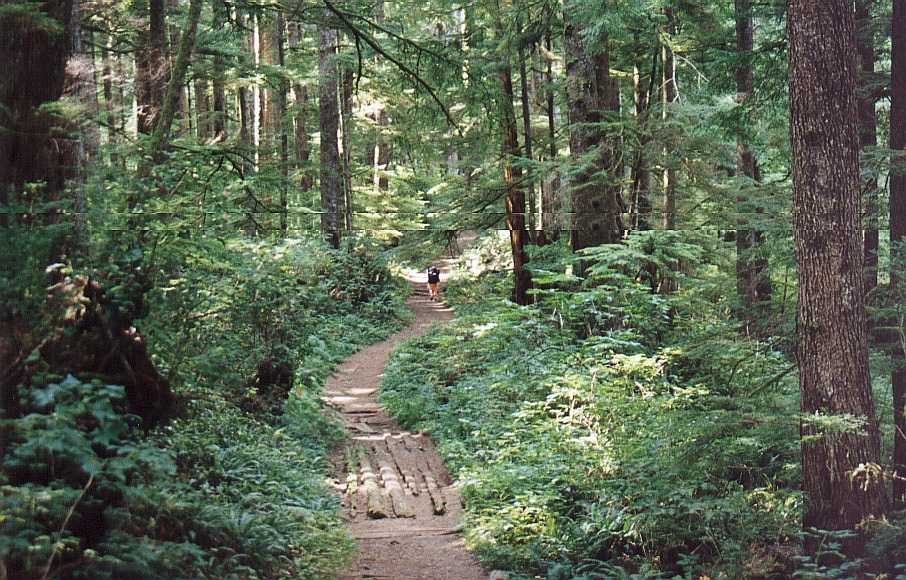 A partir du poste d'accès nord, à coté de la réserve indienne et du très beau camping de Pachena Beach, le sentier de la West Coast Trail débute par une large piste déambulant paisiblement à travers une forêt d'arbres géants. Le plafond végétal est très haut et dense, tandis que le lit de la forêt, quand à lui, est clairsemé de grosses fougères. De multiples ponts, escaliers et plateformes, assiste la marche, ce qui en fait une belle balade. C'est une des agréables surprises que l'on trouve sur la West Coast Trail; l'abondance de structures, bien construites et entretenues, réduisant de beaucoup le niveau de difficulté de celle-ci.