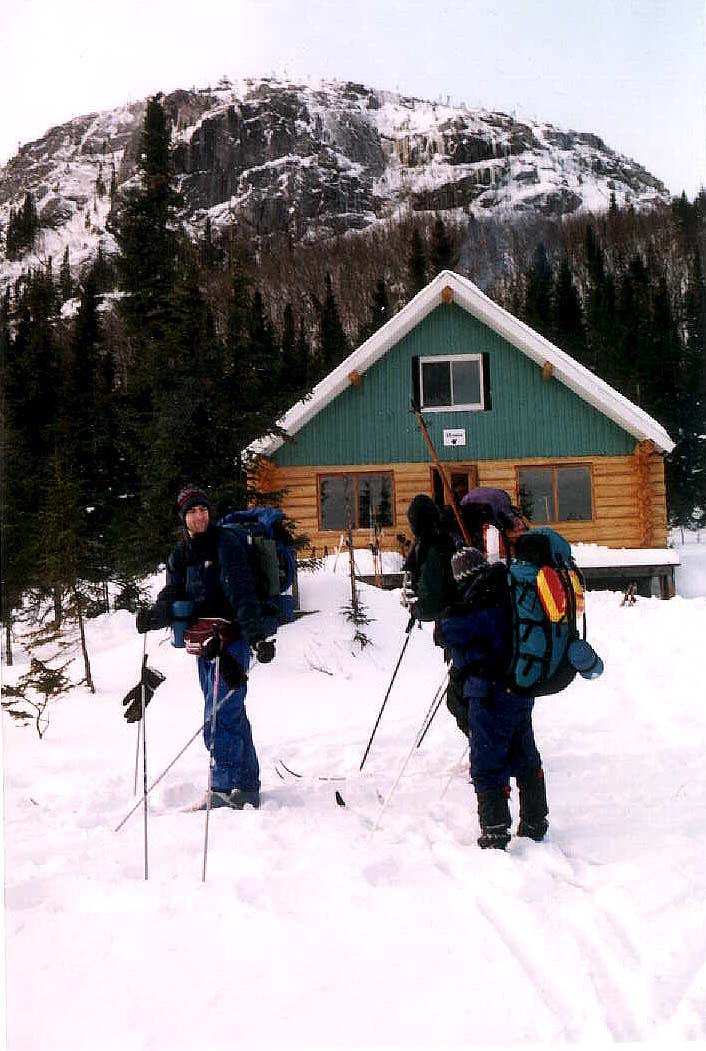 En partant du camp Jean-Pierre Cadot la piste longe le lac à l'Ecluse et s'enfonce tranquillement entre de petites montagnes, suivant le ruisseau aux mouches (Hmmm... Ca doit pas être drôle ici au mois de juin...) Nous atteignons rapidement le chalet de l'écureuil qui, entouré de montagne et surplombé par une superbe falaise, trône dans une forêt clairsemée de résineux. Un site réellement exceptionel qui va sûrement faire partie d'une de nos prochaine visite dans la région! A partir de là la piste bifurque vers le nord. Nous nous suivons à la queue leue-leue sur un tracé très sinueux qui se faufile dans un terrain chaotique à travers les épinettes. Les petites descentes et montées, avec leurs lots de chutes, nous ralentissent quelque peu cependant. Heureusement les pistes sont fraîchement ouvertes ce qui facilite la progression.