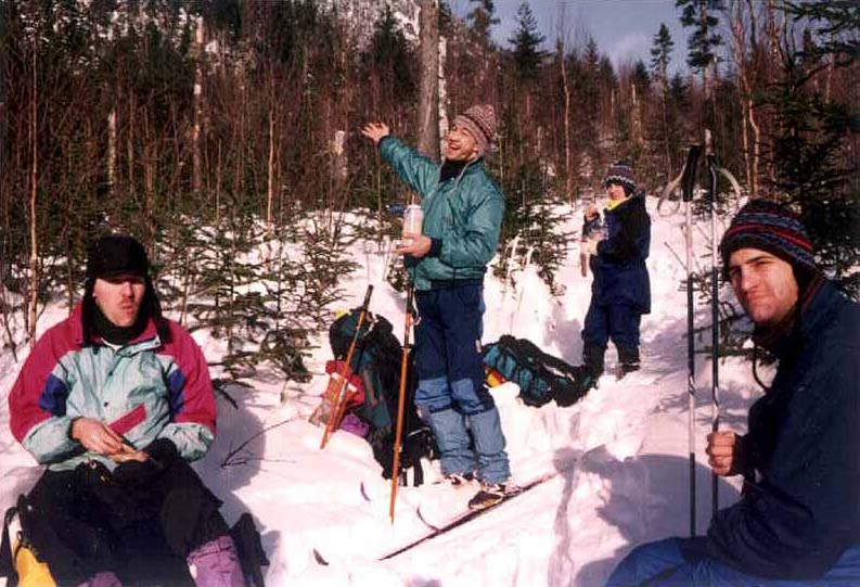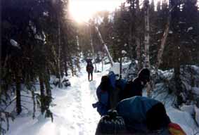 Il y a ici une quantité incroyable de neige!! Près d'un mètre en une seule tempête la fin de semaine dernière. Une fois tombé, il est très difficle de se relever seul. Denis se retrouve même pris dans une espèce de trou où la couche de neige est particulièrement épaisse. Il faudra l'aide de deux d'entre nous pour le sortir de là... Peu de temps après, c'est à mon tour et après quelques vains efforts je commence à comprendre ce que doit ressentir une tortue renversée sur le dos dans une fosse de sable mouvant. Couché dans la neige, empêtré dans mes skis, la moitié du corps enseveli, je cherche en vain un point d'appui. Mes bâtons s'enfoncent presque jusqu'à la garde et du plus profond que je puisse aller avec ma main, rien de solide ne me permet de m'y appuyer. Dès lors pour des raisons de sécurité, rester groupés nous semble être impératif et le groupe, qui s'était étiré sur presque un kilomètre, progressera désormais ensemble.