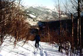 Nous nous arrêtons au trois quart de la montée et dînons allignés à même la piste. Quelques uns d'entre nous en profitent pour enlever leurs skis. Ils n'iront pas loin! La neige leur monte facilement jusqu'à la mi-cuisse et remonter sur ses skis devient alors tout un exploit. La pause est tout de même de courte durée car il est déjà tard (près de 12H30) et nous n'avons couvert que seulement un tiers de la distance totale que nous avons à faire aujourd'hui. La montée est heureusement assez courte et, malgré un passage particulièrement abrupte et étroit, rapidement négociée. Arrivé en haut, un paysage spectaculaire s'offre à nos yeux.