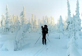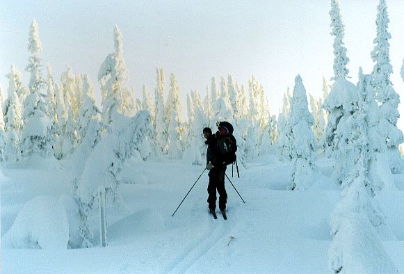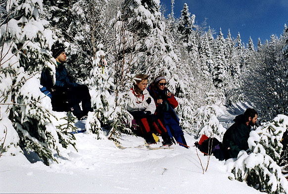Après un long dîner de 1H30, (impossible de résister à une température si belle!), l'équipe reprend la route. Le sentier monte continuellement, petit à petit, tandis que les heures passent et que le soleil pénèttre de moins en moins profondément dans la forêt. Les pauses se font plus fréquentes et les estimations quant à notre position sur la carte, toujours trop optimiste. Annie et Julie échangent skis et bottines afin de pouvoir se partager une des seules paires de skis hors pistes avec carres que nous avons.
