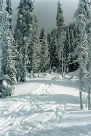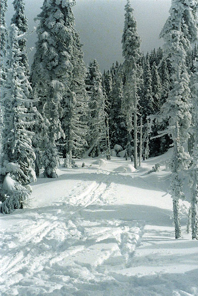 Après un kilomètre à partir du Huard, nous nous enfonçons dans le sous-bois. Les arbres sont recouverts d'une couche givrée laissée là par le brouillard humide d'hier. La vue qu'ils offrent est surprenante sombre et quelque peu irréelle. Un plafond de nuage assez bas laisse cependant entrevoir les montagnes qui se dressent devant nous. Quelques kilomètres plus loin nous arrivons au lac Côté et le paysage qui s'offre à nous lorsque nous le traversons est époustouflant!! On se sent tout écrasé par les massifs qui l'entourent de si près.