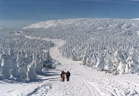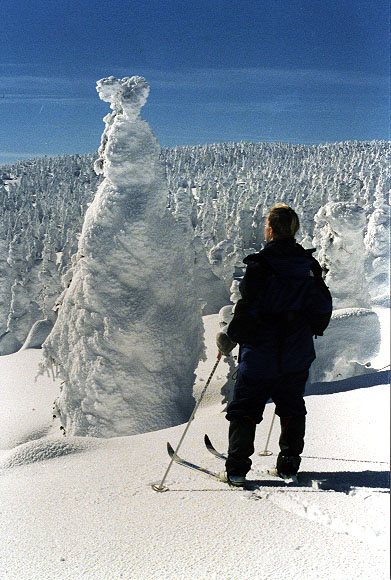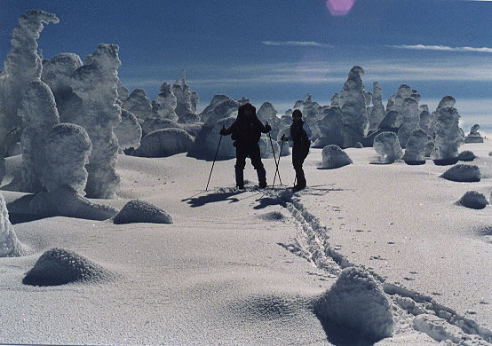 Nous nous réveillons tôt le matin. Le refuge de la Chouette où nous avons passé la nuit ainsi que celui du Nictale (50 mètres plus bas) sont admirablement situés, assez haut sur les flancs d'une large vallée et orientés vers le mont Logan. Le soleil est encore très bas sur l'horizon et devant nous se trouve une grande vallée enneigée de milliers de fantômes blancs. Celle-ci est parsemée d'arbres qui sont complètement recouvert de neige. Seules quelques branches, orientées vers le sud, réussissent à en percer l'épais manteau. Ce sont eux que nous avons apperçu hier soir. Déjà impressionant, ils n'en sont que plus fantastiques le jour venu.