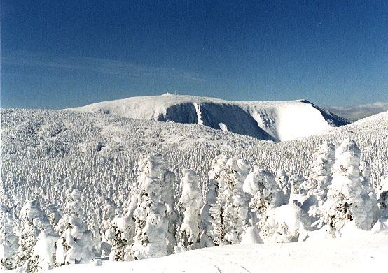 Le sommet est atteint vers 12H30. Nous y passerons près d'une heure a contempler le paysage, assis dans la neige à coté de la cabane contenant les instruments météorologiques qui parsème le sommet. On peut voir le fleuve et les montagnes de la Côte Nord au loin ainsi que les plus hauts monts des Chic-Chocs; Albert, Jacques-Cartier, plus à l'est. Nous y rencontrons même des gens qui ont passé la nuit dans le refuge (relai sur la carte?!) du mont Logan... Les chanceux ont pu voir tout un coucher de soleil hier soir!!! La prochaine fois on y réservera une place.