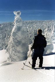 La première chose que nous faisons est la corvée d'eau. Deux équipes de deux skieurs, emportant avec eux toutes les bouteilles que nous avons, partent dans la vallée afin de localiser une source. Celle-ci se trouverait à une centaine de mètre de la piste en direction du sud, selon ce que nous ont dit les acadiens rencontrés la veille. Heureusement, les arbres sont assez espacés, ce qui nous a permis d'explorer en même temps la forêt de fantômes blancs tout en skiant dans un mêtre de poudreuse vierge!! Nous faisons rapidement le tour du périmètre de recherche, effectuant une pointe à plus de 500 mètres du refuge vers un lac que nous avons apperçu sur la carte topo. Celui-ci reste inatteignable; trop loin, trop bas, de toute manière évidement gelé et recouvert d'une bonne couche de neige. Cependant, la vue que nous en avons est très belle, avec des kilomètres carrés de neige vierge. Nous n'avons donc pas trouvé de point d'eau à proximité et avons dû finalement faire fondre de la neige, ce qui a pris pas mal de temps.