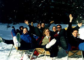 Nous faisons une longue pose et dînons au soleil sur le bord de la piste. Les thermos contenant la soupe chaude nous fait du bien. Quelques skieurs montant vers la roulotte nous croisent et nous n'osons à peine leur dire qu'il reste plus de 12 kilomètres de faux plats à monter. D'autant plus que nous leurs décrivons les paysages que nous avons vu la journée précédente. Les pauvres ne se doutent pas encore que demain sera une journée misérable avec un fine pluie et une visibilité restreinte... Deux heures de glisse et de descente plus tard nous traversons le grand lac en face du refuge du Huard. Il est à peine 14H00!!! C'est bien la première fois que j'arrive si tôt à un refuge... Nous sortons toutes les chaises dehors, les plantons dans la neige et improvisons un petit centre de bronzage naturel! Ceci était pour nous la dernière belle journée de la randonnée. Demain commence la pluie et nous ne reverrons plus le soleil avant Montréal...