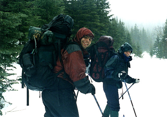 Le moral reste bon même si c'est tout a fait inskiable. La neige/glace granuleuse est gorgée d'eau et même le klister ne prend pas. Nous ferons le trajet avec les peaux, seul façon d'avancer. Après une demi-heure nous sommes tous trempés jusqu'au os, donc pas questions d'arrêter trop longtemps pour manger ou se reposer. Il faut continuer.