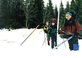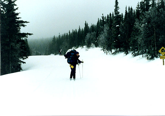 La piste suit la route (fermée à la ciculation en hiver) qui nous mènera en dehors du parc. Celle ci est large et nous offre une descente de près de 8 kilomètres. Nous n'en profiterons pas beaucoup car nos skis défoncent la neige fondue et nous fait chuter dès que nous prenons un peu de vitesse.