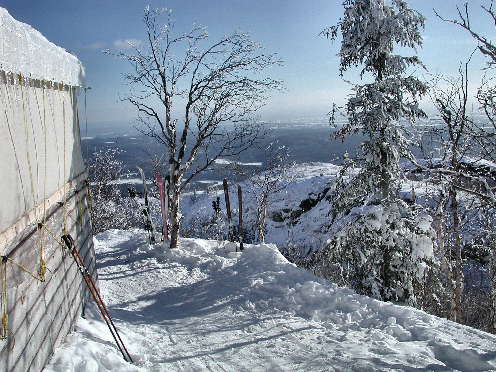 Vue superbe du refuge Nelligan. Celui-ci est perché sur un pic rocheux qui surplombe. On peut même voir le fjord du Saguenay ainsi que les lumières de la ville de Chicoutimi lorsqu'il fait nuit. Un endroit idéal pour les amateurs de Télémark qui y trouverons beaucoup de terrains de jeux aux alentours.