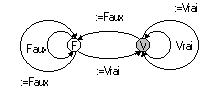 Le système de transitions de la Figure I.2 modélise le comportement d'une variable booléenne. L'ensemble d'états contient les deux valeurs possibles pour une variable booléenne, c'est-à-dire soit elle est vraie ou soit elle est fausse. L'alphabet dénombrant les actions possibles est U= { :=Vrai, :=Faux, Faux, Vrai }. Les deux premières actions modélisent le fait que l'on peut assigner une valeur booléenne à la variable. ":=Vrai" assignant la valeur Vrai à la variable et ":=Faux" assignant la valeur Faux. Les deux autres actions représentent le fait que l'on peut effectuer une requête pour déterminer la valeur de la variable.