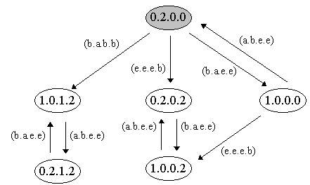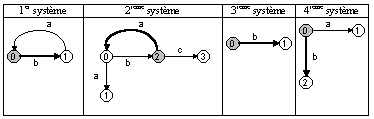 Nous avons une liste de quatre petits systèmes de transitions. L'ordre des systèmes de transitions est important car c'est lui qui nous permettra de décrire les transitions et états globaux sous la forme de liste dont le ième état, ou la ième transition, appartient au ième système de transitions. Par exemple, la transition globale déterminée par les sous-transitions en gras dans le Tableau I.2 est identifiée par la liste (b.a.b.b). Il en va de même pour l'identification des états globaux. Cependant, afin de pouvoir différencier ces derniers de la représentation des transitions globales, leurs listes seront précédées de la lettre e.