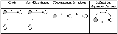 Les systèmes de transitions permettent de représenter aisément et avec concision des concepts fondamentaux des systèmes concurrents, tel le choix, le non-déterminisme, le séquencement, l'infinité des traces [Hoare,78] . Le Tableau I.1 montre comment ces concepts peuvent être représentés dans le modèle des systèmes de transitions.